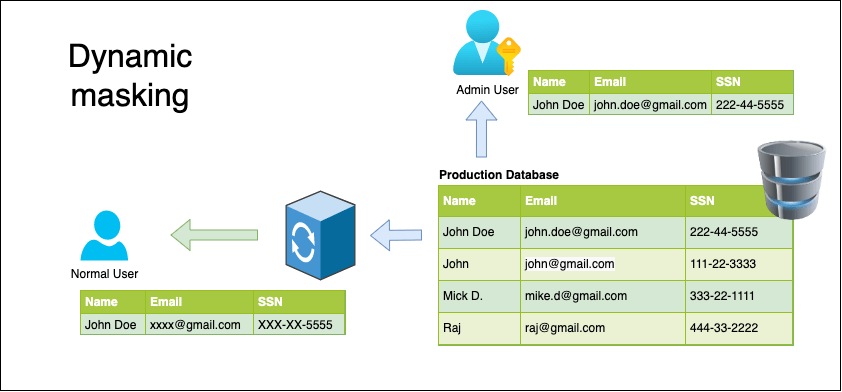 Dynamic Data Masking: Dynamic data masking (DDM) aims to replace sensitive data in transit leaving the original at-rest data intact and unaltered.